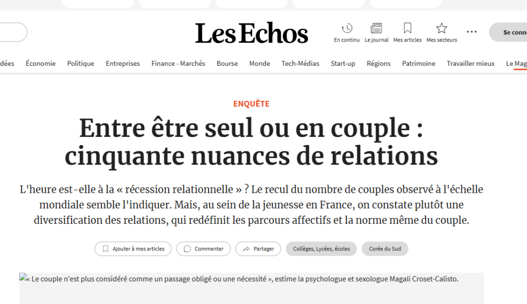 Article à retrouver en ligne : Entre être seul ou en couple : cinquante nuances de relations | Les Echos