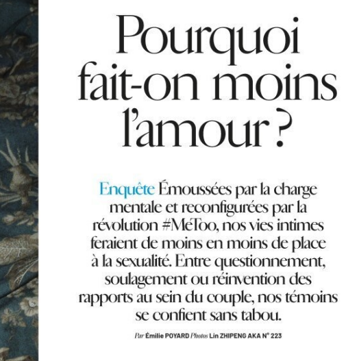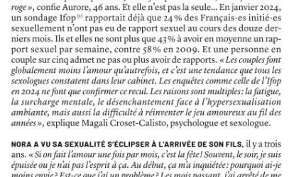 Magali Croset-Calisto répond aux questions de la journaliste Emilie Poyard dans le cadre de l’enquête « Pourquoi fait-on moins l’amour », Marie-Claire, décembre 2025.
